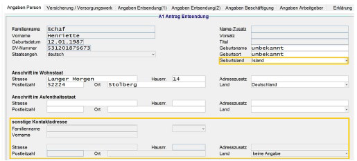 Personalstamm > SV/Steuer > A1 Bescheinigung > A1 Antrag Entsendung > Registerkarte Angaben Person