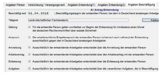 Die Felder der Registerkarte „Angaben Beschäftigung“ dienen dazu, die für eine Entsendung nach Artikel 12 Absatz 1 VO (EG) Nr. 883/2004 bzw. den grenzüberschreitenden Einsatz von Beschäftigten im öffentlichen Dienst nach Artikel 11 Absatz 3 Buchstabe b) Verordnung (EG) Nr. 883/2004 zwingend notwendige weiterbestehende arbeitsrechtliche Anbindung zwischen Arbeitgeber und Arbeitnehmer abzufragen.