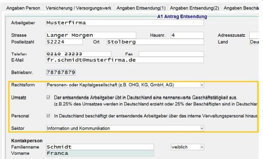 Personalstamm > SV/Steuer > A1 Bescheinigung > A1 Antrag Entsendung > Registerkarte Angaben Arbeitgeber