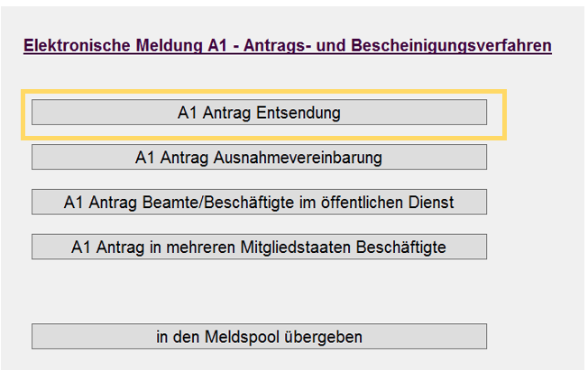2. Da die Entsendedauer unter 24 Monaten liegt, ist im Auswahlmenü A1 Antrag Entsendung