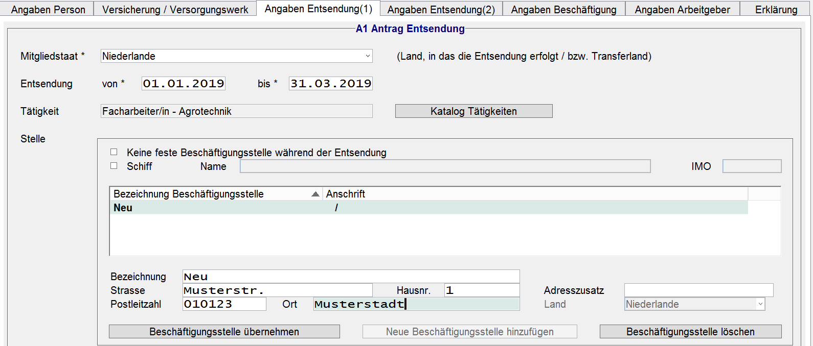 Personalstamm > SV/Steuer > A1 Bescheinigung > A1 Antrag Entsendung > Registerkarte Angaben Entsendung (2)
