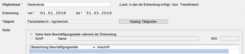 Sollten mehr als drei bis 11 Beschäftigungsstellen bekannt sein oder die entsandte Person im anderen Staat über keine feste Beschäftigungsstelle (z. B. Montage von Windkraftanlagen etc.) verfügen, ist im Feld „Stelle“ ein „Ja“ für „keine feste Beschäftigungsstelle“ anzugeben. Weitere Angaben sind dann nicht mehr nötig.
