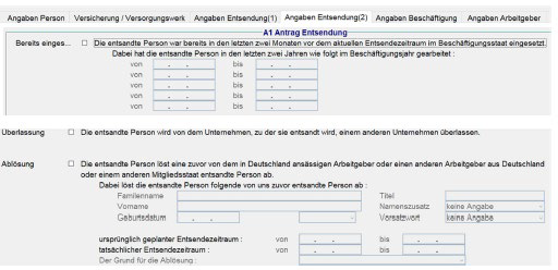 Alle erforderlichen Felder für den A1 Antrag Entsendung auf den Registerkarten Angaben Entsendung (1) / Angaben Entsendung (2) sind im Weiteren manuell zu füllen. Nutzen Sie dazu die Angaben, die Ihnen von Seiten des Arbeitgebers zur Verfügung gestellt wurden.