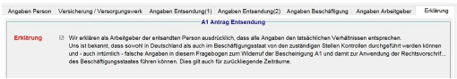Personalstamm > SV/Steuer > A1 Bescheinigung > A1 Antrag Entsendung > Registerkarte Erklärung