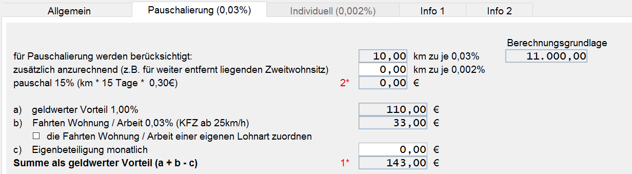 (hier z.B.: Summe Bruttolistenpreis 33.000,-- * 0,03% ergibt 9,90 €, geteilt durch 3 Benutzer = 3,30 € * km)