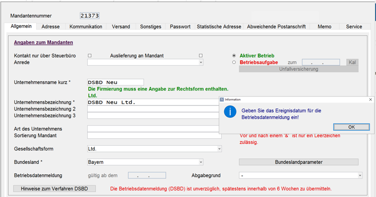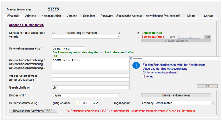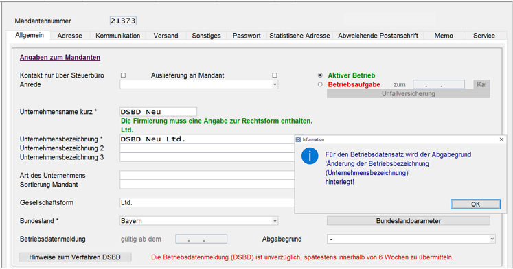 Beispiel: Änderung der Unternehmensbezeichnung von DSBD Altmandant auf DSBD Neu.