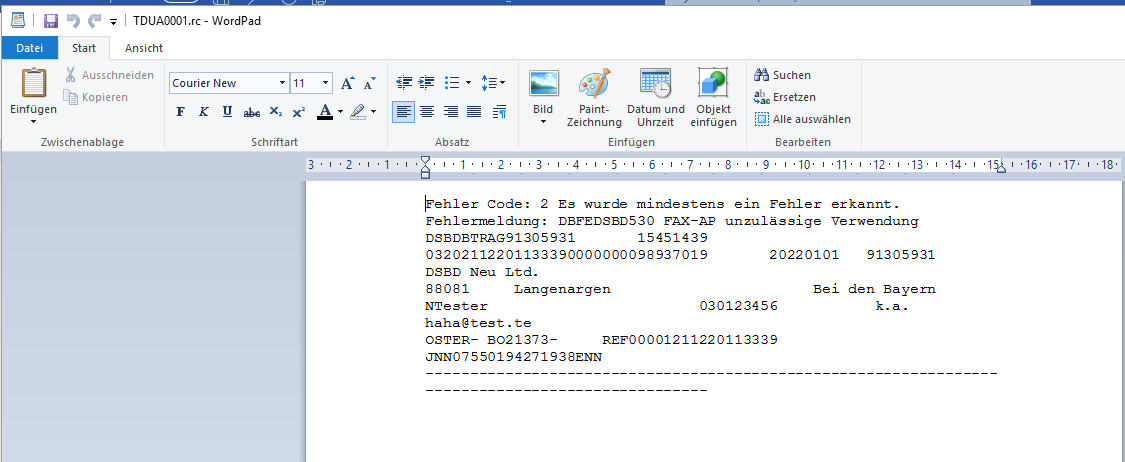 Die fehlerhafte Datei wird NICHT übertragen! Es ist darauf zu achten, dass die Eingaben korrigiert werden. Im Mandantenordner wird unter Listen eine entsprechende Datei mit der Endung .rc erstellt, in denen Hinweise zu den aufgetretenen Fehlern angezeigt werden.