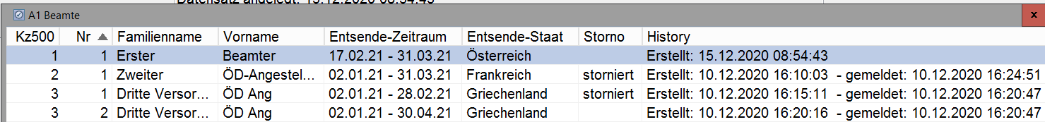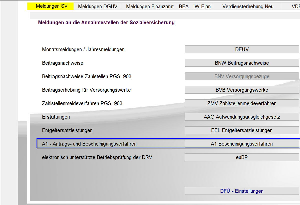 BEISPIEL: Personalstamm > SV/Steuer > A1 Bescheinigung > A1 Antrag Entsendung