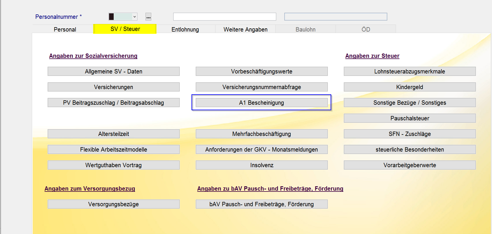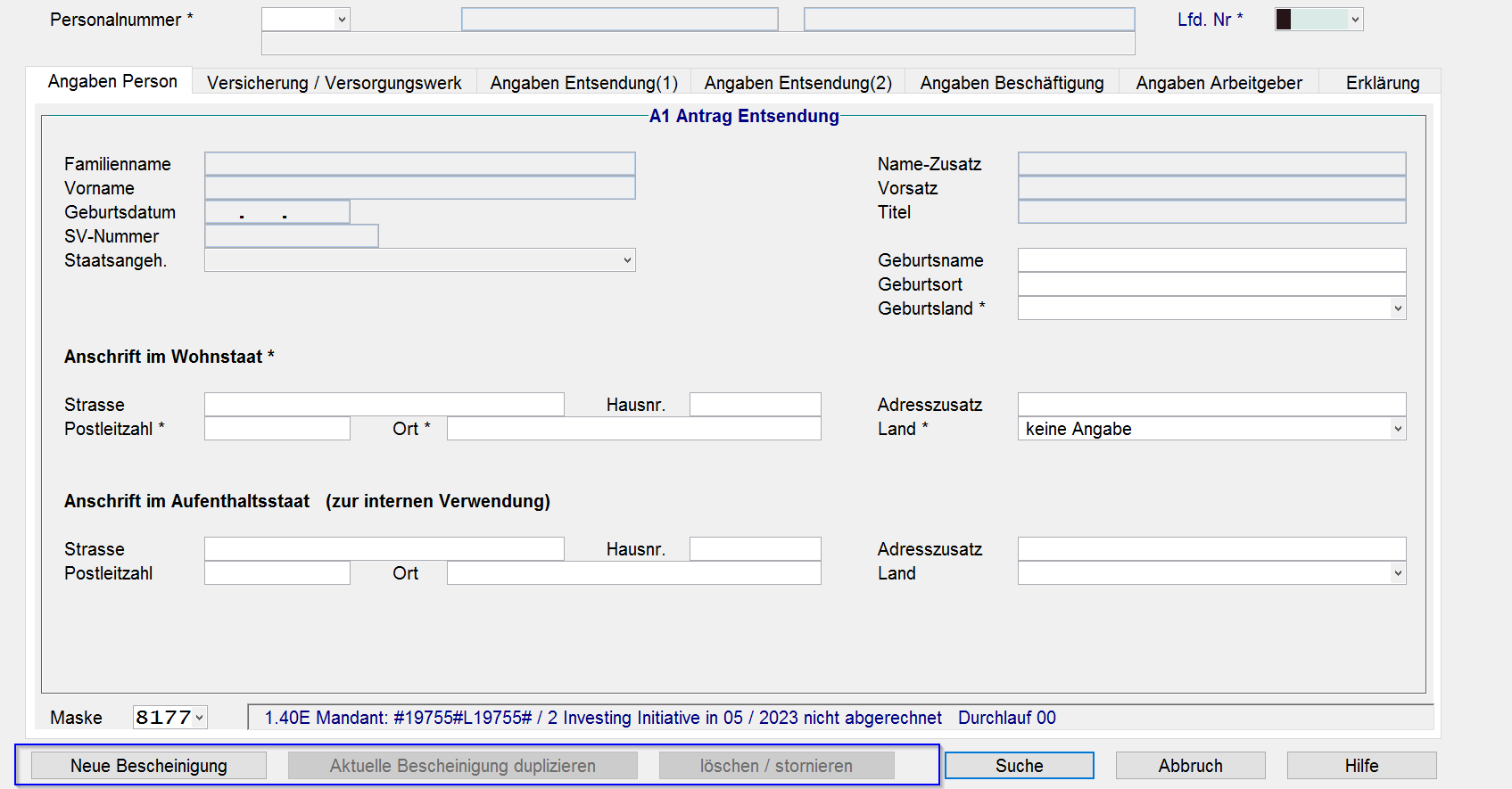 Das A1 – Antrags- und Bescheinigungsverfahren ist in den bestehenden Masken des Personalstamms / Meldewesen integriert.
